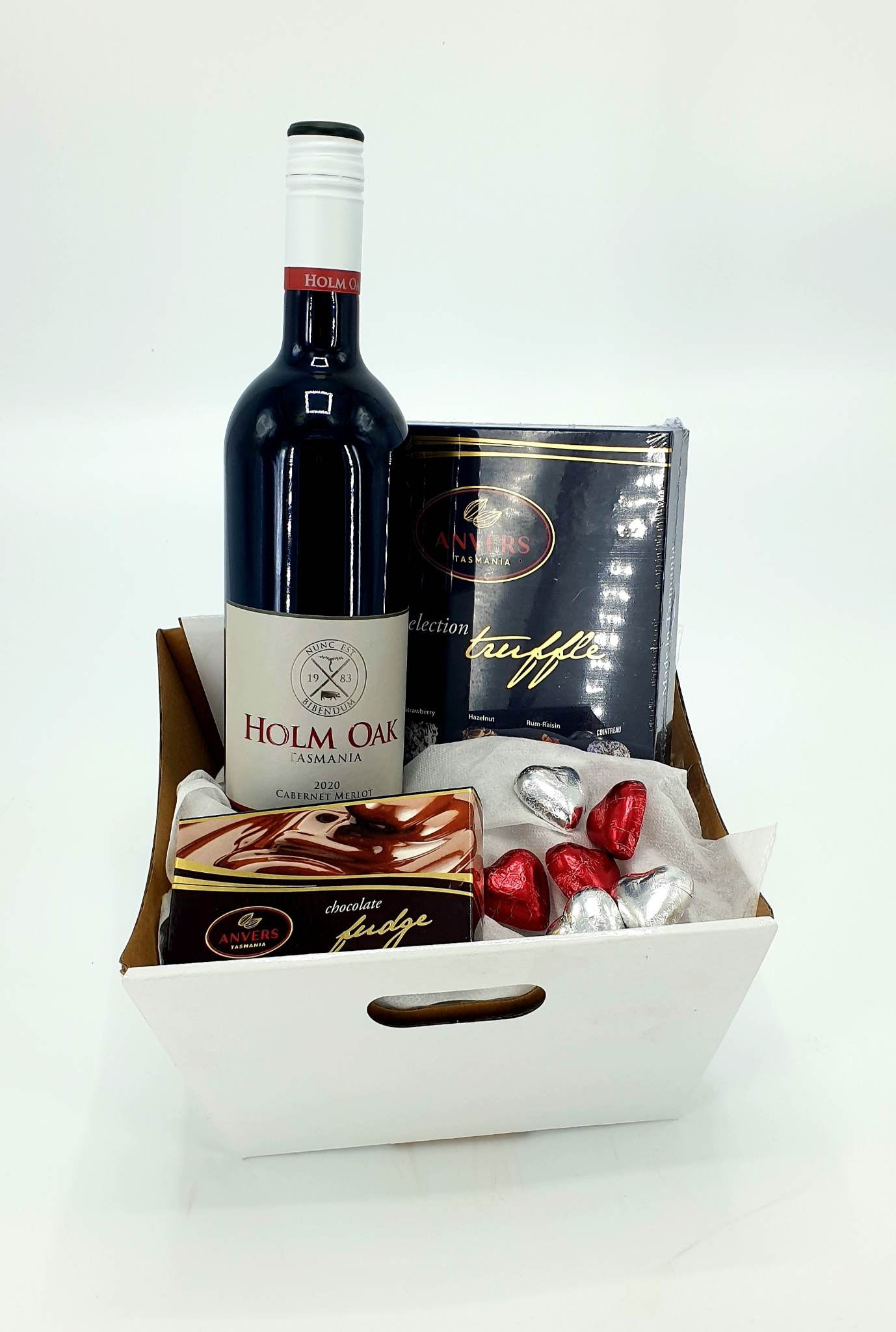 This tasteful hamper includes a bottle of Tasmania Holm oak Cabernet Merlot, 125g Anvers Chocolates, 85g Anvers Chocolate fudge and chocolate hearts.