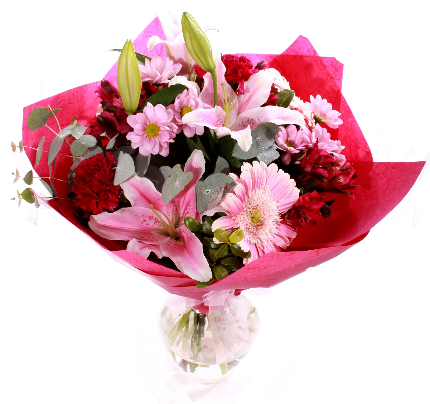 A gorgeous abundance of pinks highlight this attractive bouquet. Featuring Oriental lily, Sim Carnations, Gerberas, Alstromeria and Chrysanthemum, a perfect way to say you care.